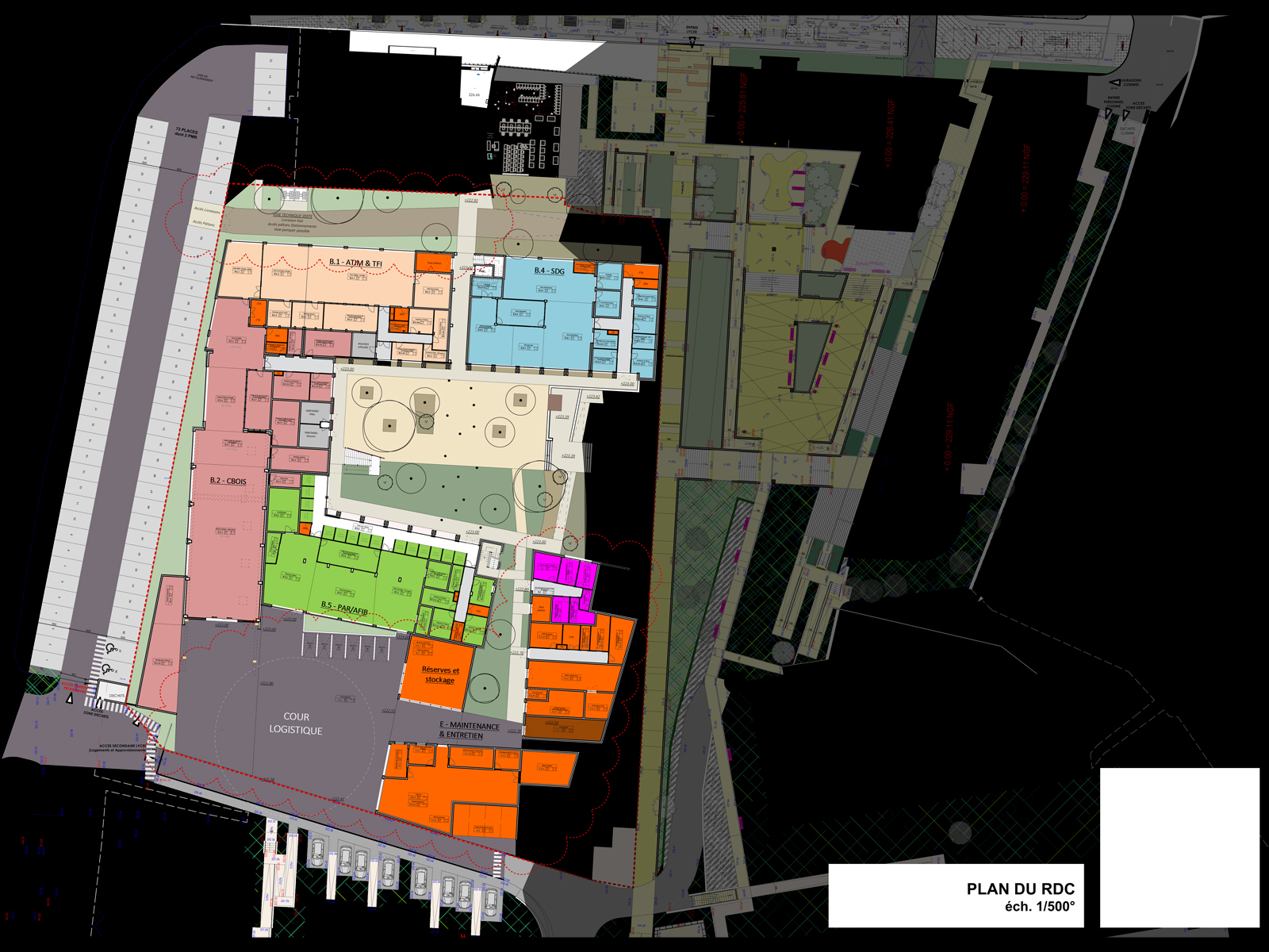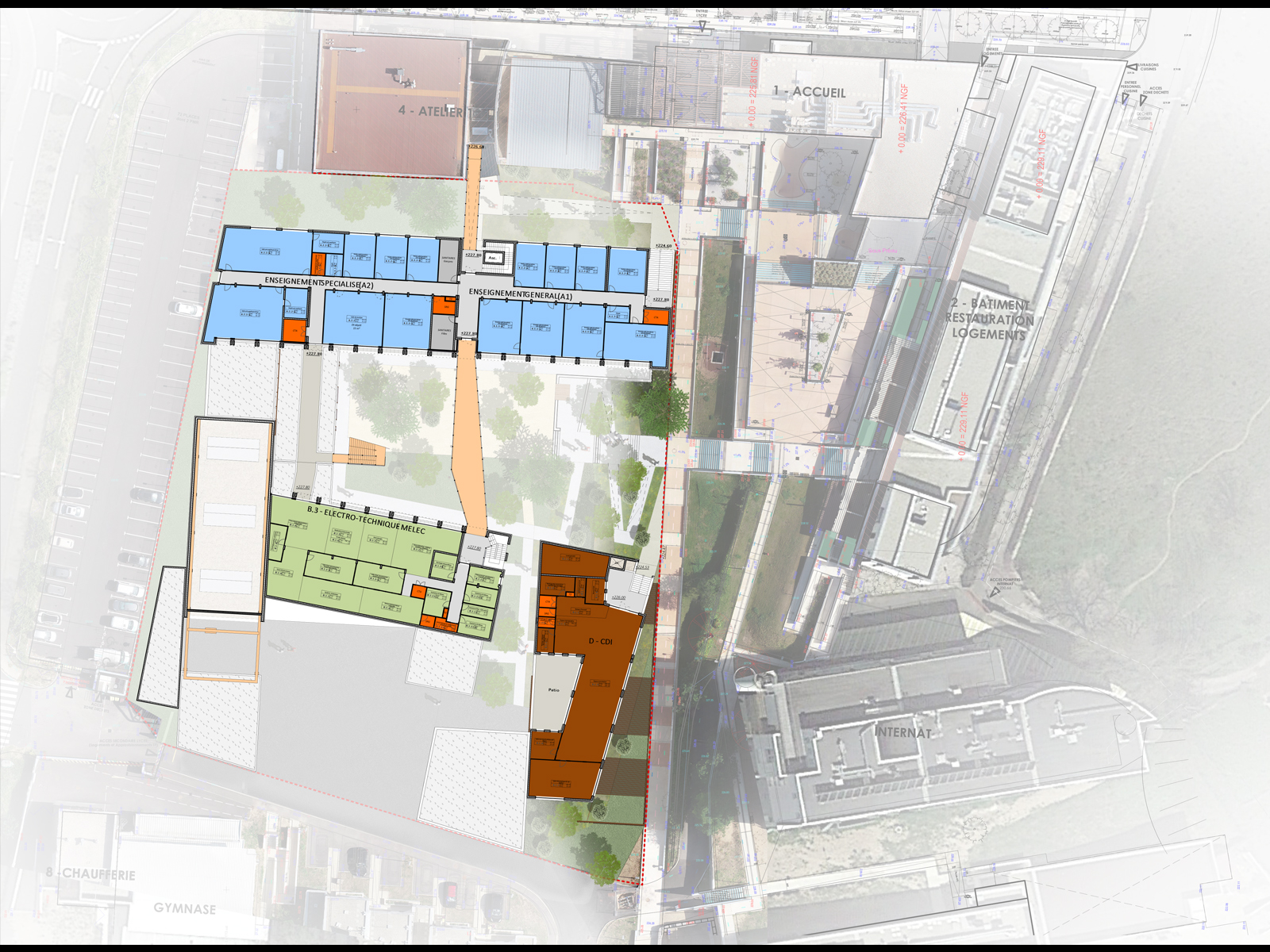 Construction d’un bâtiment Enseignement général et spécialisé, d’une halle technologique comprenant Construction Bois, Electro technique, Par Afib, Maintenance entretien, d’un bâtiment CDI…